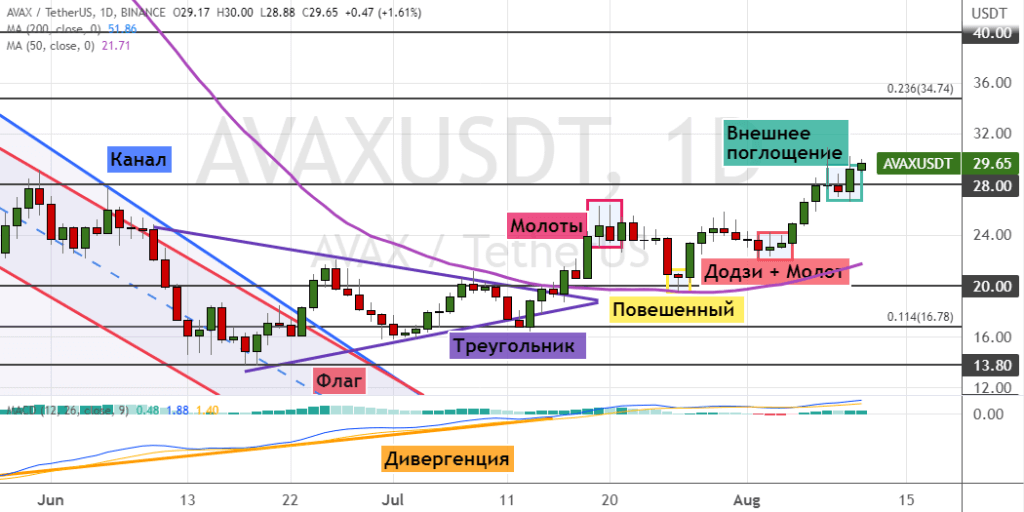 Закрытие дневных свечей выше этого уровня станет сигналом о восстановлении восходящей динамики. В таком случае краткосрочный бычий тренд позволит стоимости AVAX подняться до первых целей $32, $34.80 и $40. В пользу развития этого сценария торгов указывают восемь сигналов теханализа: модели «Додзи», «Молот» (отмечена светло-розовым цветом), «Внешнее поглощение» (отмечена бирюзовым цветом) и «Повешенный» (отмечена желтым цветом), преодоление верхних границ моделей «Флаг», «Канал» и «Треугольник», а также бычья дивергенция между ценой на графике и осцилляторе MACD.