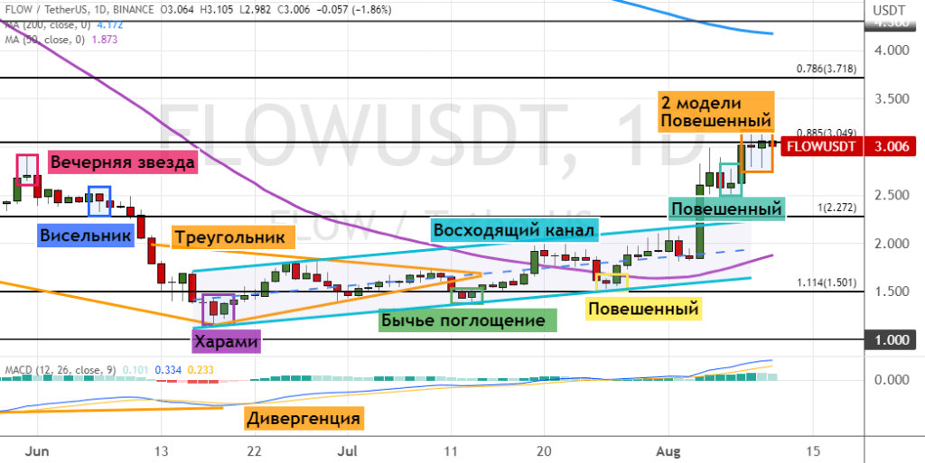 Если FLOW сможет закрепиться выше этого кластера, в рамках краткосрочного бычьего тренда котировки протестируют уровни $3.8, $4 и $4.3. Между $4 и $4.3 также проходит линия 200-дневной SMA. В пользу развития этого варианта торгов указывают восемь сигналов: четыре модели «Повешенный» (границы отмечены оранжевым, бирюзовым и желтым цветом), «Харами» и «Бычье поглощение», а также преодоление верхней границы «Восходящего канала» и бычья дивергенция между ценой на графике и осцилляторе MACD.