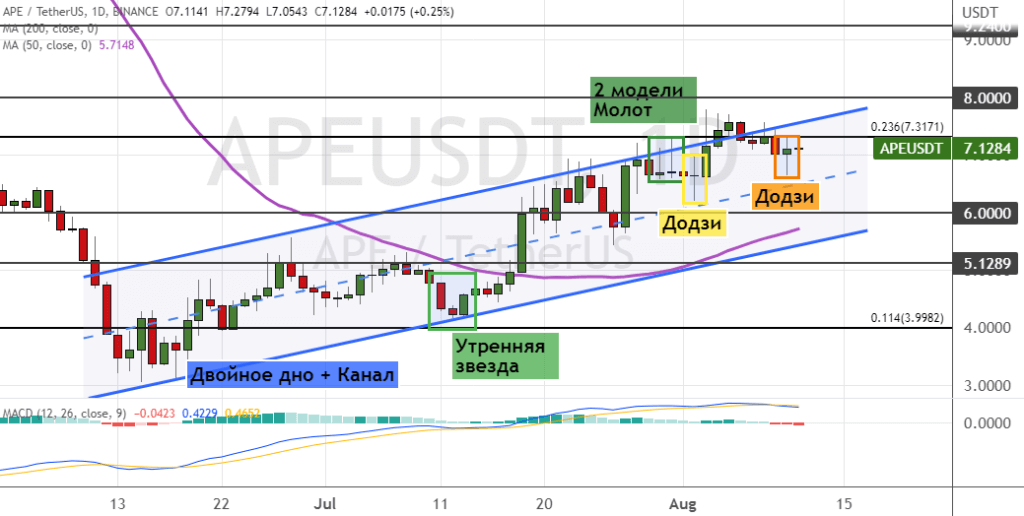 Если быкам удастся закрепиться выше сопротивлений $8 и $9.2, то в рамках среднесрочного восходящего тренда APE направится к уровням $10 и $11.3. В пользу реализации этого прогноза указывает возможное формирование двух моделей «Додзи» (обозначены оранжевыми и желтыми линиями) и три сигнала теханализа, в числе которых модели «Двойное дно», «Утренняя звезда» и возможное преодоление верхней границы «Восходящего канала».