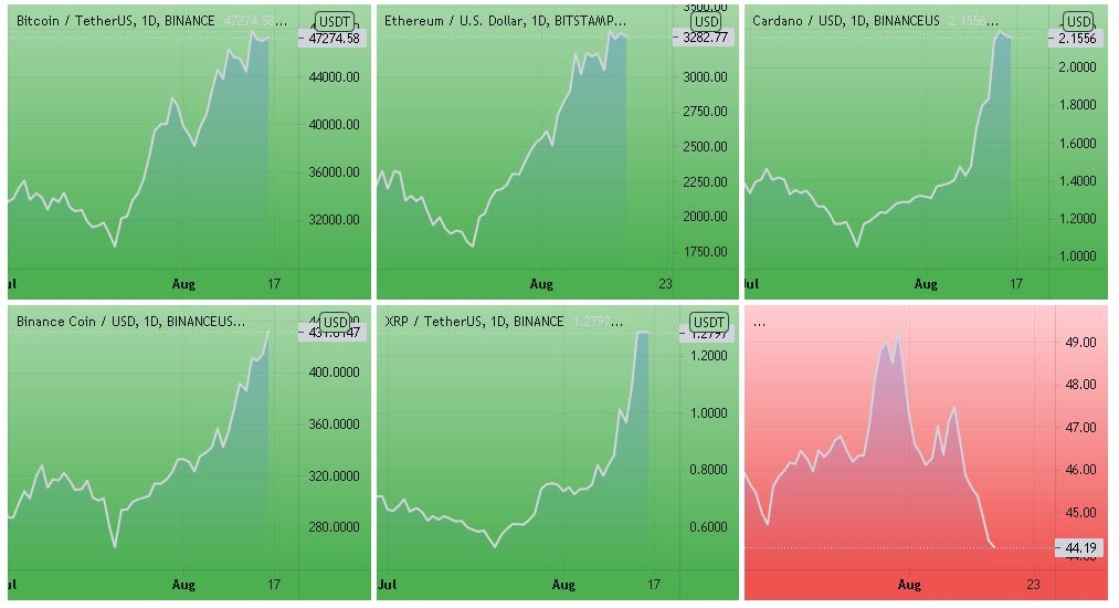 Динамика котировок BTC, ETH, BNB, ADA, XRP (дневной таймфрейм) и график доминации биткоина. Источник