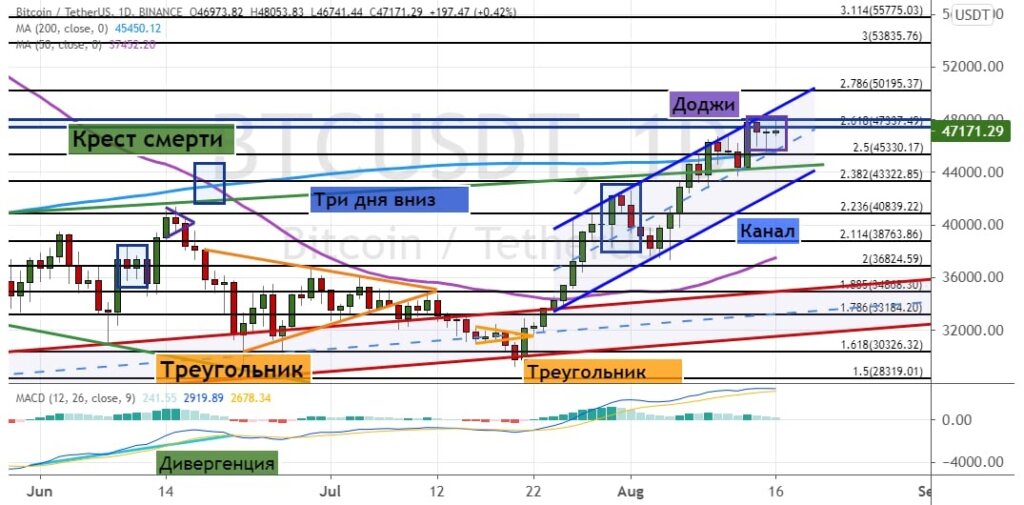 На выходных биткоин продолжил рост и даже попытался закрепиться выше $48 000, но пока эти попытка не увеначлись успехом. В результате котировки BTC откатились к $46 500, где также проходят границы «Восходящего канала» (обозначены синим цветом на графике ниже).