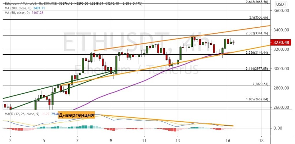 На выходных торги эфиром проходили в условиях высокой волатильности. Актив так и не смог выйти за рамки консолидаций в виде уровней $3 150–$3 350, а также пробить границы модели теханализа «Клин» (показана оранжевыми линиями на графике ниже).