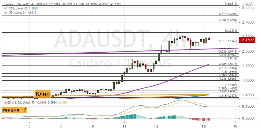 Котировки ADA поднялись выше границ графической модели «Клин» и пытаются закрепиться выше линии тренда (отмечены на графике ниже). Это позволило альткоину подняться на 4-е место в топе криптовалют по капитализации.
