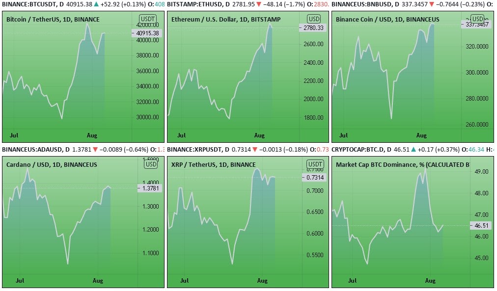 Динамика котировок BTC, ETH, BNB, ADA, XRP (дневной таймфрейм) и график доминации биткоина. Источник