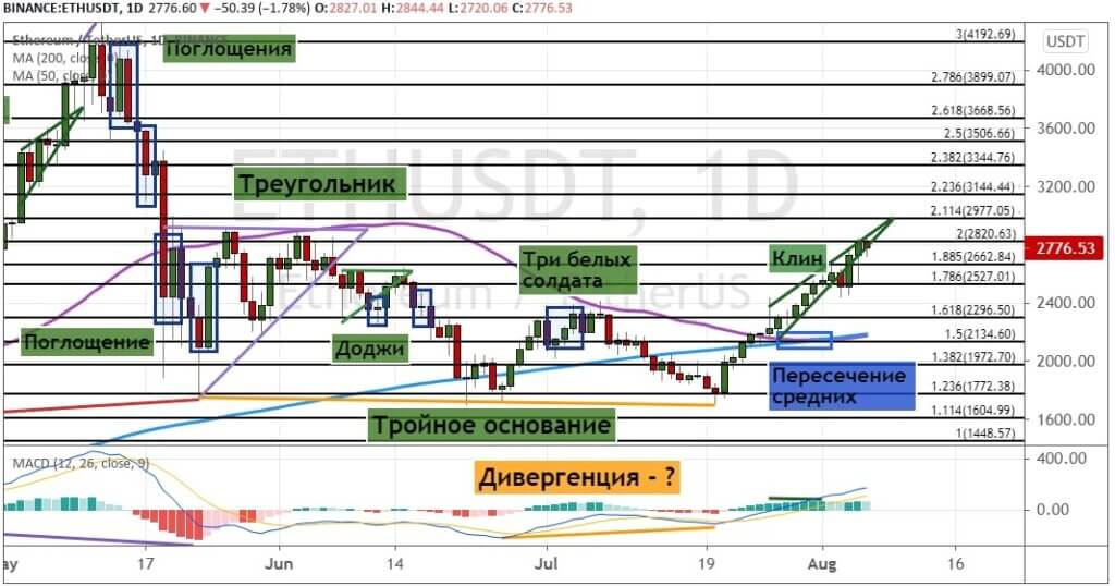 Котировки эфира позитивно отреагировали на успешное проведение хардфорка London. Это привело к возврату ETH в границы модели теханализа «Клин», что может стать сигналом для продолжения восходящего движения. Обязательное условие для этого — закрытие дневных свечей выше уровня $2 820.