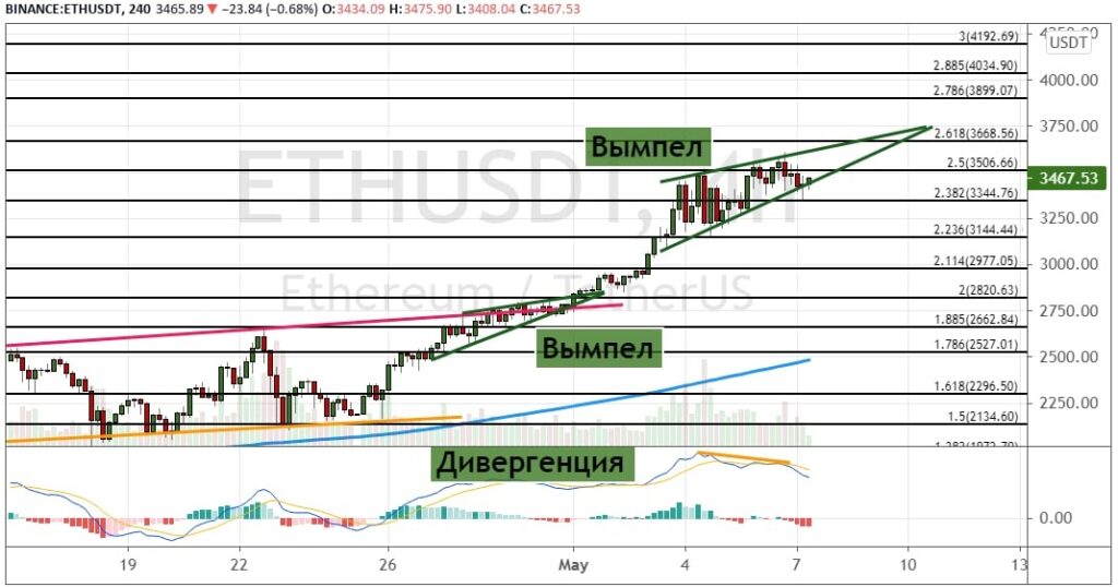 Эфир взял еще один рекорд на этой неделе, поднявшись выше уровня $3 800, в районе которого и проходят текущие торги. Это движение котировок приобретает вид модели теханализа «Вымпел» (представлена на графике ниже).