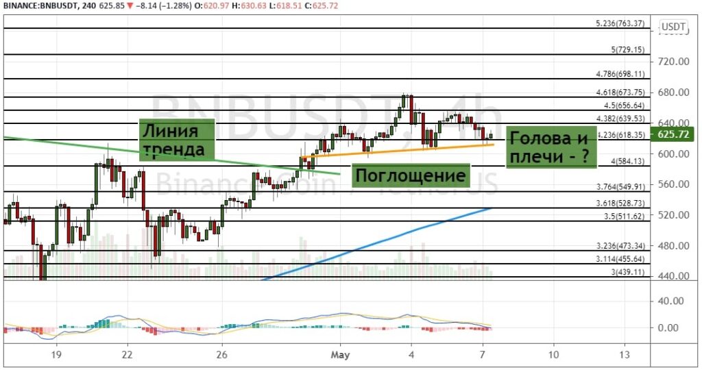 На графике BNB вскоре могут появиться сигналы, указывающие на развитие нисходящей коррекции. Так, если BNB закрепится ниже $620, то котировки альткоина уйдут в нисходящее движение в рамках модели «Голова и плечи» (представлена на графике ниже). Это может привести к обвалу стоимости BNB до уровней $600, $580, $550, $530 и $511, где проходит линия 200-дневной SMA. Пока более глубокая коррекция к $480, $450 и $440 представляется маловероятной.