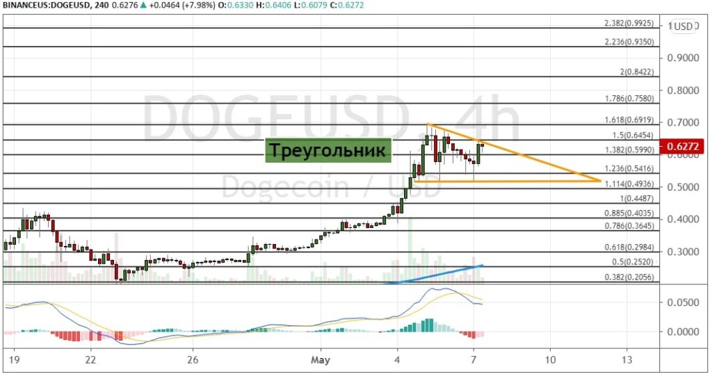 Подтвердит эти риски уход котировок DOGE ниже важной поддержки на $0.5. Это направит котировки мем-коина вниз к целям $0.45, $0.40, $0.36 и $0.3. Ниже последней также расположилась линия 200-дневной SMA. Более того, в пользу возможного снижения указывает цена на осцилляторе MACD, которая все так же находится в зоне «перекупленности».