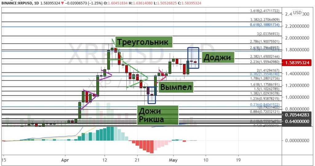 XRP в моменте поднялся до цели $1.80, однако от него котировки альткоина снизились к уровням $1.56 и $1.65. Более того, сформировались на графике ниже свечные комбинации «Доджи», которые могут стать дополнительными сигналами в пользу развития снижения. Это направит стоимость XRP к горизонтальной консолидации $1.28–$1.41 и далее к уровням $1.18 и $1.10, где проходит мощная линия 200-дневной SMA.