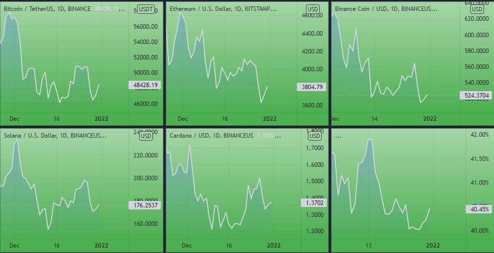 Динамика котировок BTC, ETH, ADA, BNB, XRP (дневной таймфрейм) и график доминации биткоина. Источник