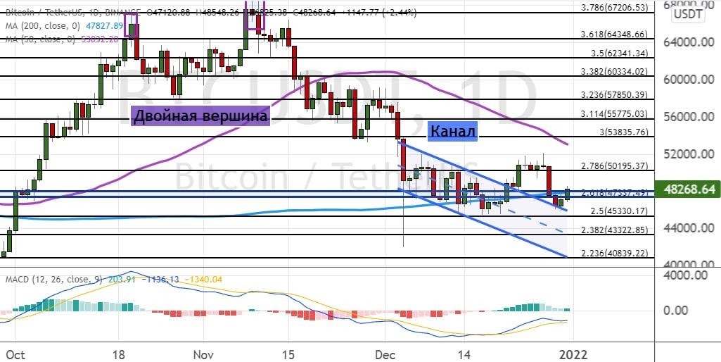Однако если биткоин опустится ниже границ кластера уровней $47 300–$48 000, внутри которого расположилась линия 200-дневной SMA, то он может снова опуститься до $45 300, где проходит верхняя граница модели теханализа «Нисходящий канал» (обозначена на графике ниже синим цветом), и $43 300. Более глубокая коррекция пока представляется маловероятной, однако может привести к снижению до $40 800.