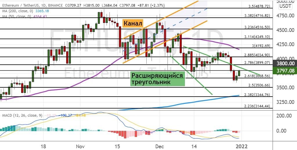 Текущей поддержкой для котировок ETH выступает уровень $3 670. На графике ниже можно отметить, как от этого уровня произошел коррекционный отскок к $3 800, где проходит верхняя граница модели теханализа «Расширяющийся треугольник» (обозначена на графике ниже салатовым цветом).