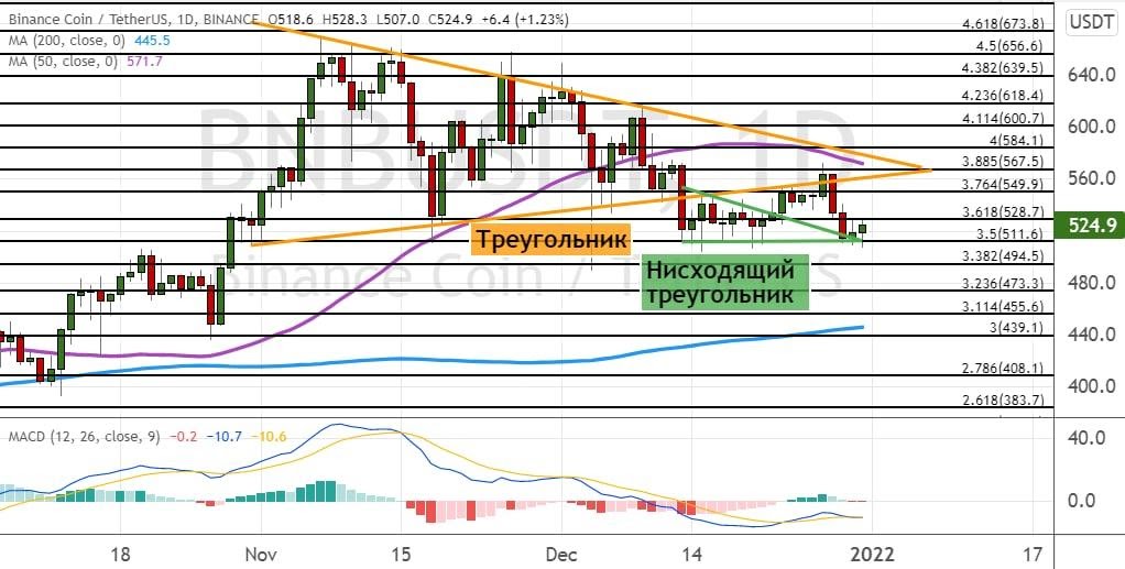 Текущие торги BNB проходят между уровнем поддержки $511, где расположены границы модели теханализа «Нисходящий треугольник» (обозначена на графике ниже салатовым цветом), и сопротивлением $530.