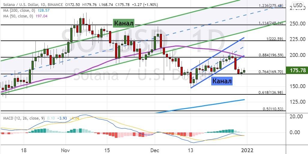 Котировки SOL не смогли преодолеть уровень текущего сопротивления $200, где расположены верхняя граница модели теханализа «Восходящий канал» (обозначена на графике ниже синим цветом) и линия 200-дневной SMA, и вновь опустились к поддержкам $170 и $180. Сохранение нисходящего импульса приведет к более глубокому падению до поддержек $150, $137, где проходит линия 200-дневной SMA, и $110.