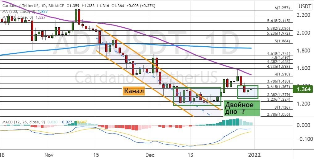 При этом рост выше уровней сопротивления $1.43 и $1.51, где проходит линия 50-дневной SMA, позволит котировкам восстановить краткосрочный восходящий тренд. В таком случае альткоин направится к целям $1.6, $1.7, $1.75 и $1.90, где также проходит линия 200-дневной SMA. В пользу этого сценария развития торгов указывает формирование модели теханализа «Двойное дно» (показана на графике ниже зеленым цветом).