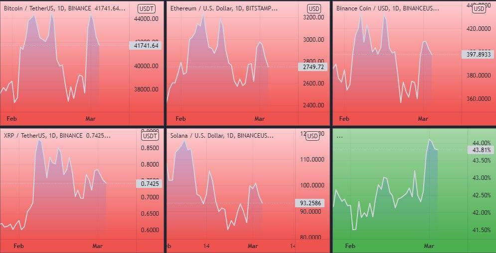 Динамика котировок BTC, ETH, ADA, BNB, XRP (дневной таймфрейм) и график доминации биткоина. Источник