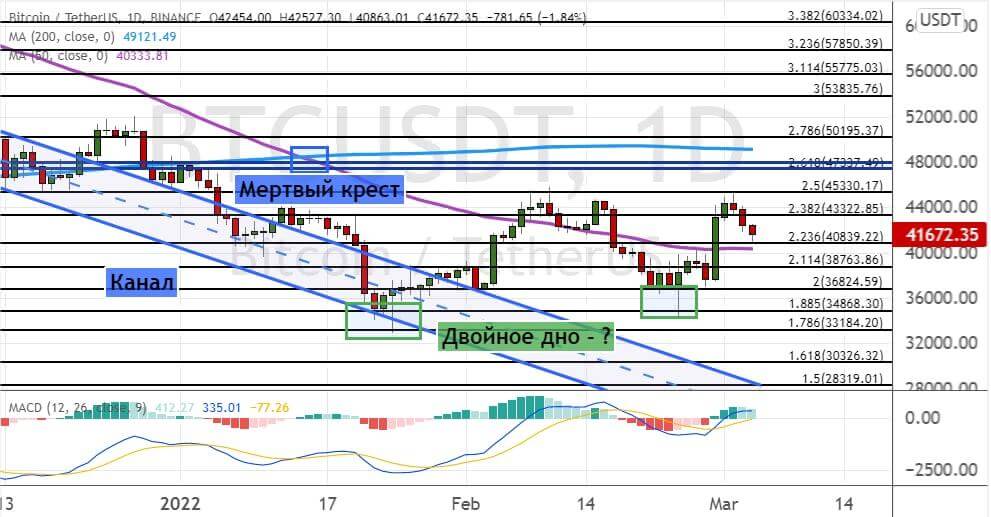 Однако нельзя забывать и о таком медвежьем сигнале, как модель теханализа «Мертвый крест» (обозначена на графике ниже линиями синего цвета), которая сохраняет свою актуальность. Если котировки BTC опустятся ниже $38 800, то целями для медвежьей динамики последовательно выступят уровни поддержки $35 000, $33 200 и $30 300.