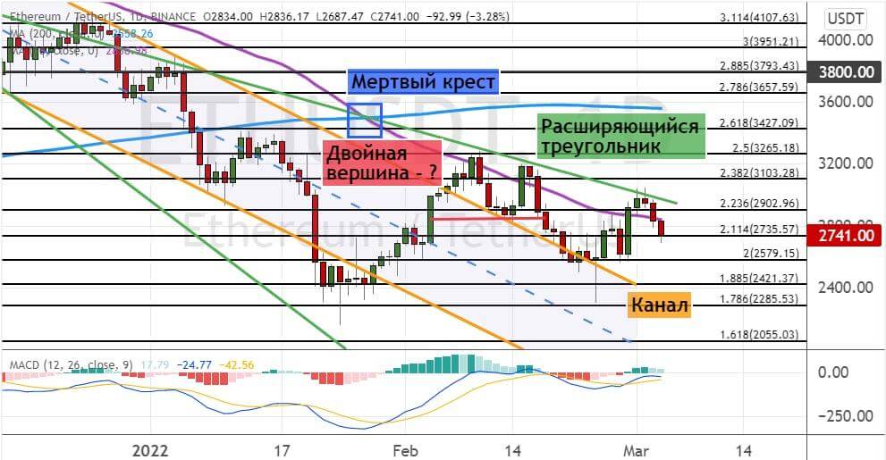 В случае роста стоимости альткоина выше $3 000, где проходит верхняя граница модели теханализа «Расширяющийся треугольник» (на графике ниже ее границы отмечены линиями зеленого цвета), стоит ожидать восстановления восходящего тренда. Он позволит эфиру достичь целей $3 100, $3 270 и $3 430, где также расположена линия 200-дневной SMA.