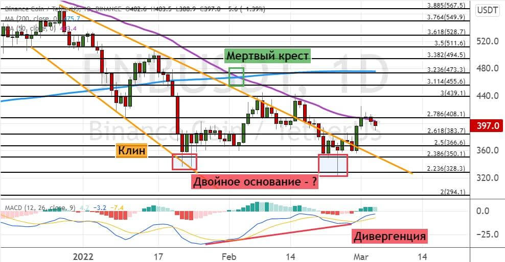 При этом BNB сохраняет потенциал для развития новой волны коррекции, что будет подтверждено в случае обвала альткоина ниже $380. В таком случае котировки BNB устремятся к первой цели $365. А более глубокая коррекция направит стоимость к $350. В пользу этого варианта указывает сохраняющая актуальность глобальная модель теханализа «Мертвый крест» (обозначена на графике ниже линиями зеленого цвета).