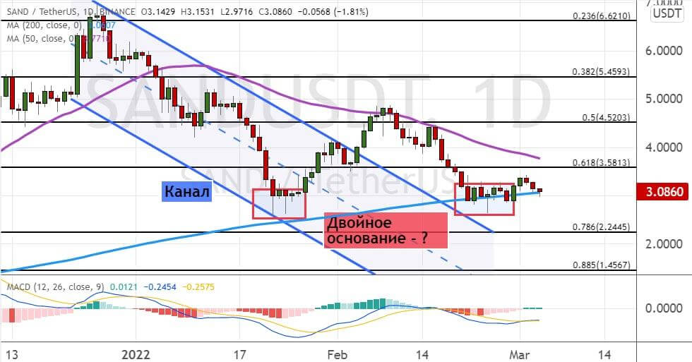 Но если стоимость SAND опустится ниже $3, то альткоин направится к поддержкам на уровнях $2.5 и $2.25, где проходит верхняя граница модели теханализа «Канал» (обозначена на графике ниже линиями синего цвета).