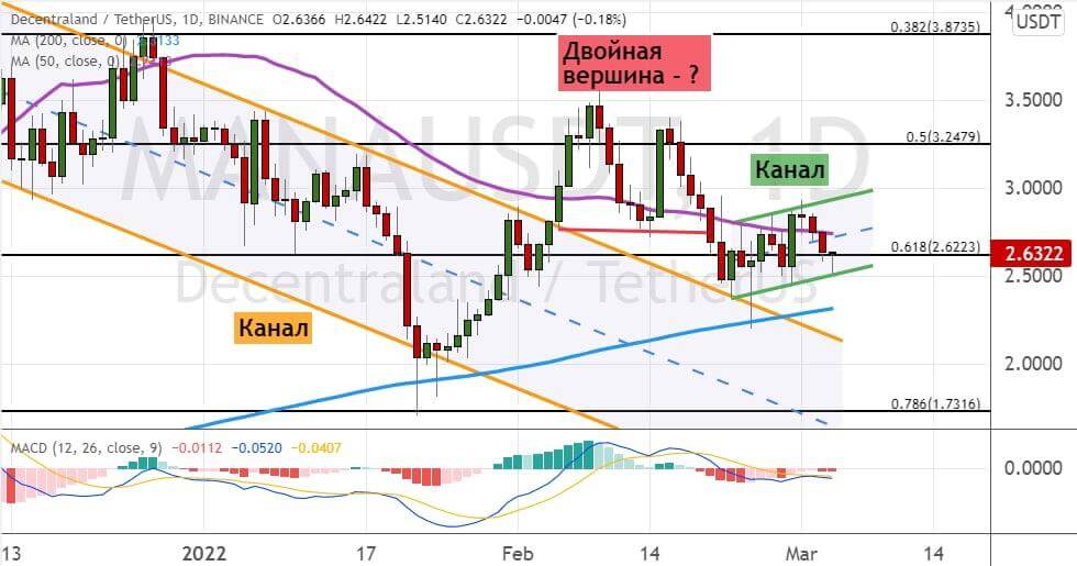 MANA от виртуального мира Decentraland торгуется чуть ниже уровня $2.6, где проходит линия 50-дневной SMA, и в рамках границ модели теханализа «Восходящий канал» (на графике ниже границы отмечены линиями зеленого цвета). Текущим сопротивлением выступает уровень $3, а линия поддержки проходит в районе $2.5.