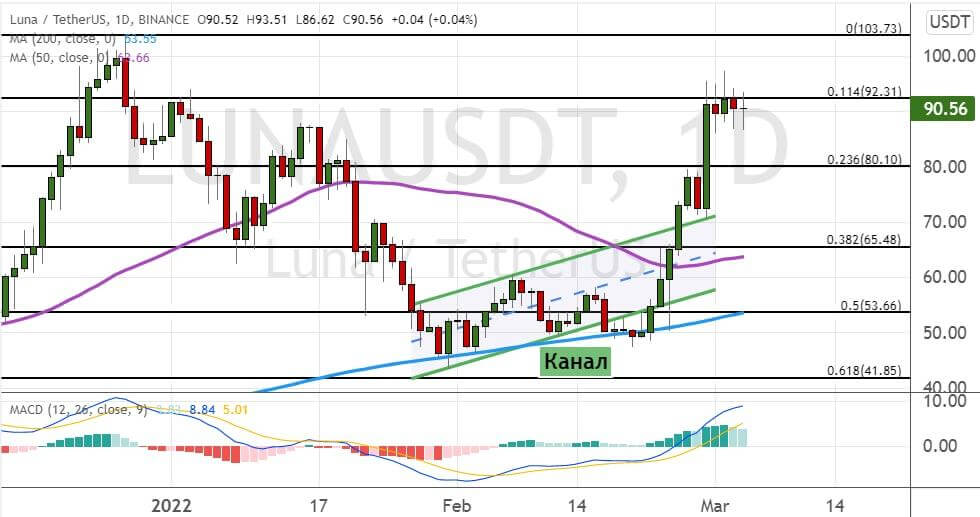 На рынке DeFi  первое место продолжает удерживать криптовалюта LUNA от проекта Terra. Торги монетой идут чуть ниже уровня $93. Если стоимость LUNA опустится ниже $80 и $70, где проходит верхняя граница модели теханализа «Канал» (обозначена на графике ниже линиями зеленого цвета), то возможен обвал до уровня $65. В районе этого уровня также проходит линия 50-периодной SMA.