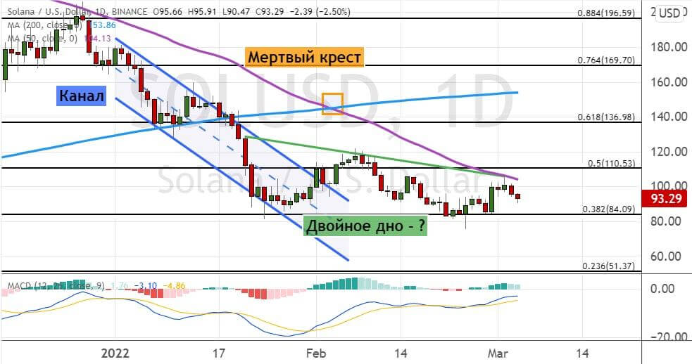 При этом на графике SOL также сохраняются сигналы о возможном развитии новой волны нисходящего движения. Оно может привести к обвалу стоимости альткоина до $70 и $52. В пользу этого сценария развития торгов указывает сохраняющая актуальность модель теханализа «Мертвый крест» (обозначена на графике ниже линиями зеленого цвета).