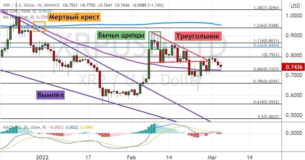 Стоимость XRP продолжает консолидацию между поддержкой $0.72, где также расположена линия 50-дневной SMA, и сопротивлением, расположенным на границах консолидации уровней $0.78–$0.8. В районе текущего уровня сопротивления также проходит граница модели теханализа «Треугольник» (на графике ниже обозначена линиями бордового цвета).