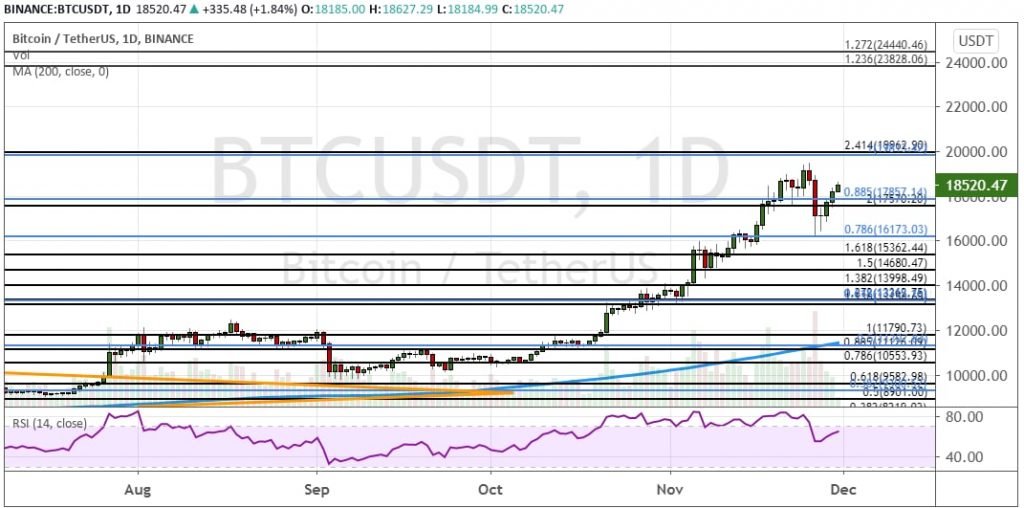 Биткоин протестировал поддержку на уровне $16 173 (78.6% коррекция по уровням Фибоначчи), но не закрепился ниже нее. В результате котировки BTC развернулись от этого уровня и начали расти в попытках преодолеть сопротивления в области $17 860 – $18 000. Если дневные свечи закрепятся выше сопротивления $20 000, то стоит ожидать обновления исторических максимумов. В краткосрочной перспективе это позволит биткоину достичь цели $21 752. При этом среднесрочными целями остаются отметки $22 000 и кластер уровней $23 820 – $24 440.