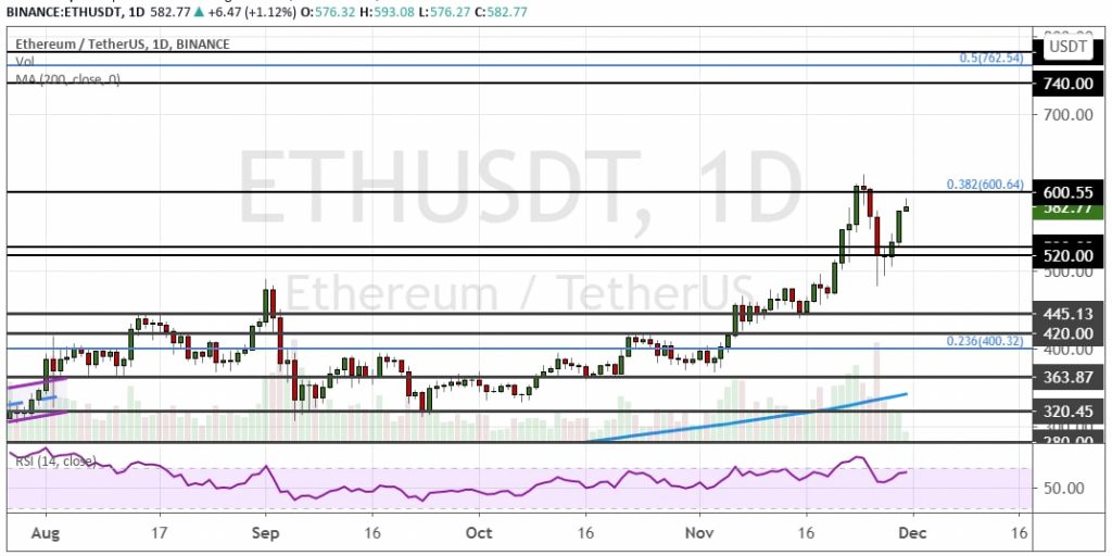Котировки эфира готовятся к завтрашнему запуску Ethereum 2.0. Запуск долгожданного обновления привел к росту капитализации второй криптовалюты. Важным сопротивлением для котировок ETH остается уровень $600 (38.2% коррекция по уровням Фибоначчи). Его преодоление в перспективе позволит котировкам достичь уровня $630, $660 и далее среднесрочной цели $700. В то же время стоит отметить, что с 2018 года цена эфира не поднималась выше $600, поэтому многие инвесторы начнут фиксировать прибыль на достигнутых уровнях. Из-за этого взрывной рост стоимости актива пока выглядит маловероятным.