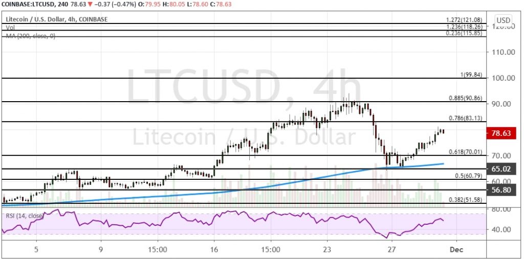 На младшем таймфрейме лайткоин сформировал так называемое «Двойное дно», что отправило котировки альткоина вверх от поддержек $65 и $70, где сейчас проходит линия 200-дневной SMA. Целями выступают $83, $90.80 и $100.