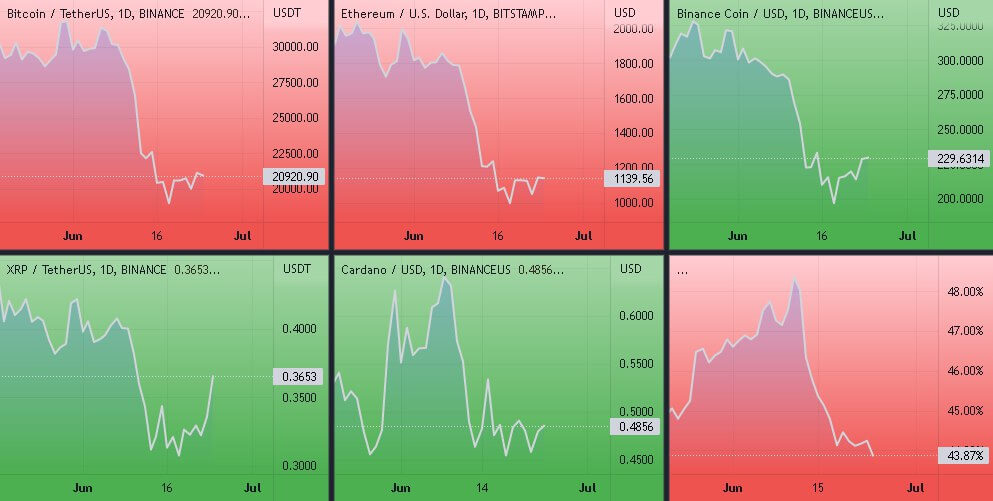 Динамика котировок BTC, ETH, BNB, SOL, XRP (дневной таймфрейм) и график доминации биткоина. Источник