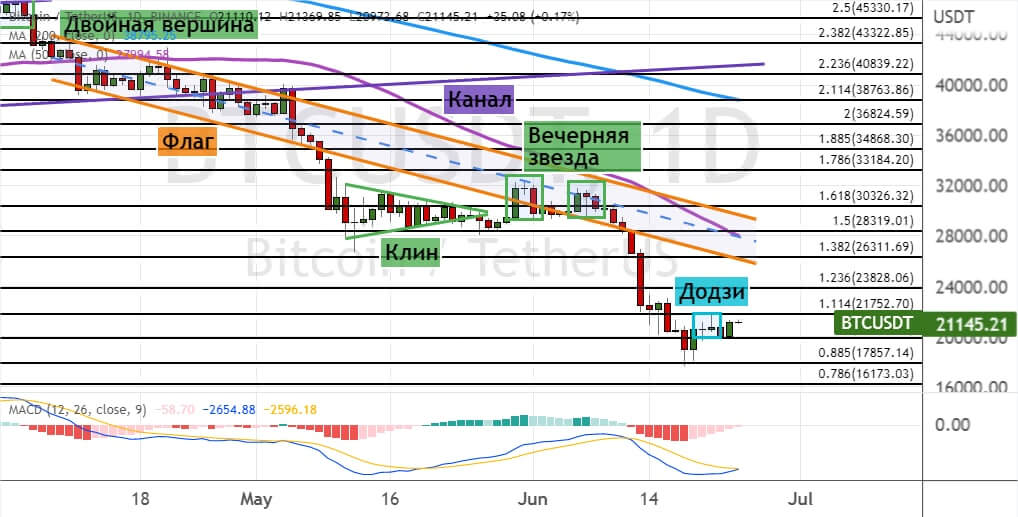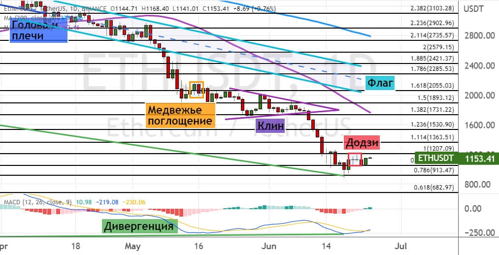 Если стоимость ETH опустится ниже важного уровня $1 000, то первыми целями для медведей выступят уровни $920, $800 и $680. На возможное восстановление медвежьего тренда указывает шесть сигналов теханализа: модели «Додзи», «Голова и плечи» (границы отмечены линиями синего цвета), «Медвежье поглощение» (обозначена оранжевым цветом) и «Висячий человек», а также пробитие нижних границ «Флага» и «Клина».