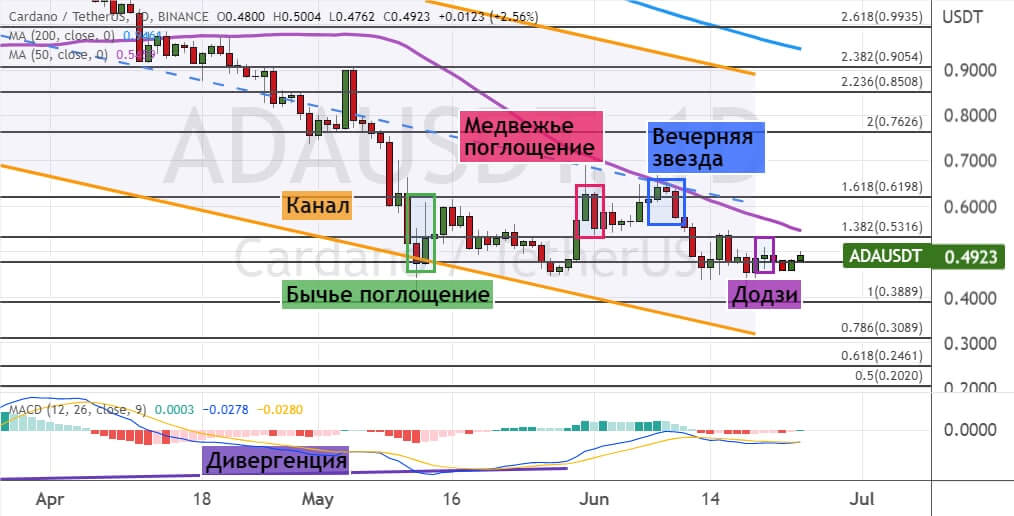 Однако снижение стоимости ADA ниже $0.48 будет сигналом о восстановлении краткосрочного нисходящего тренда. Это приведет к падению котировок ADA до поддержек $0.4 и $0.31. В районе $0.31 также проходит нижняя граница модели теханализа «Канал». В пользу развития нисходящего тренда указывают три сигнала: модели теханализа «Медвежье поглощение» (обозначена красным цветом), «Додзи» и «Вечерняя звезда» (обозначена синим цветом).