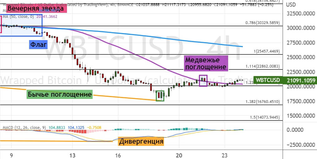 Закрытие дневных свечей ниже $20 000, где также проходит линия 50-периодной SMA, приведет к падению стоимости токена до целей $18 000 и $16 700. Более глубокая коррекция направит WBTC к уровням $15 000 и $14 080. В пользу сохранения медвежьей динамики указывают три модели теханализа — «Медвежье поглощение», «Вечерняя звезда» и «Флаг».
