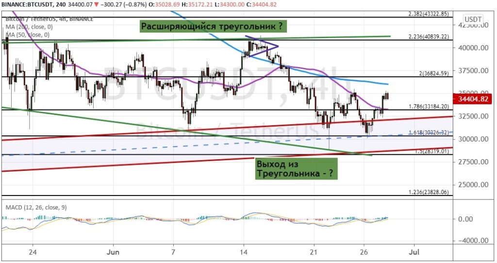 Попытки уйти вниз к поддержкам $30 300 и $28 300 не увенчалась успехом — произошел отскок котировок BTC к первой цели $33 200, где расположена линия 50-периодной SMA. Сохранение этого импульса позволит биткоину протестировать линию 200-периодной SMA, проходящей чуть ниже $36 800. А если BTC удастся ее преодолеть, это станет сигналом о развития движения к $40 800, где находится верхняя грань модели теханализа «Треугольник».