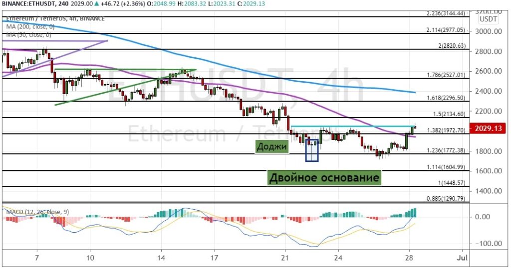Эфир не смог пробить поддержку в виде кластера уровней $1 780 – $1 820, что привело к отскоку от этого уровня. В результате эфир поднялся выше сопротивления $1 972, где также расположена линия 50-периодной SMA. Дальше котировки ETH продолжили рост и поднялись выше уровня $2 000.