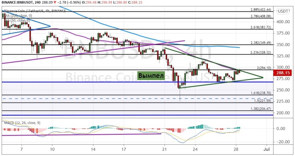 Котировки BNB развивают консолидацию, что привело к формированию модели теханализа «Вымпел» (показана на графике ниже). Если альткоин опустится ниже уровней $280 и $250, то первым целями для медведей выступят $220 и $200. А более серьезное снижение откроет путь к поддержкам на $150, $120 и $100.