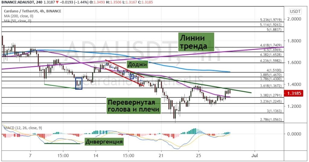 Котировки ADA формируют модель теханализа «Перевернутая голова и плечи» (показана на графике ниже). Подтвердит ее реализацию уход котировок ADA выше $1.3680. Целью для роста выступают уровни $1.43, $1.46 и $1.51, где находится 200- периодной SMA.