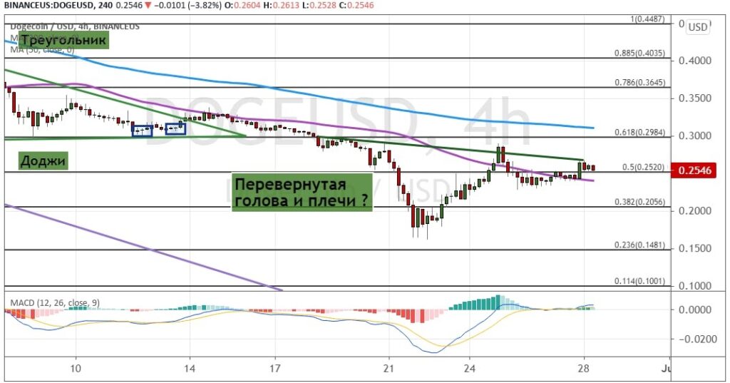 Котировки DOGE также могут сформировать модель теханализа «Перевернутая голова и плечи» (показана на графике ниже). Это может привести к отскоку от уровня $0.2520, где проходит отмеченная на графике ниже 50-периодная SMA, вверх — к $0.3. В районе этого уровня проходит линия 200-периодной SMA. Это позволит котировкам мемкоина устремиться дальше вверх к $0.3650, $0.40, $0.45 и $0.50.