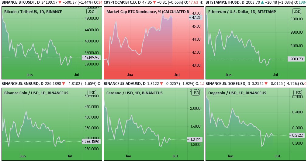 Графики котировок BTC, ETH, BNB, ADA, DOGE и доминации биткоина. Источник