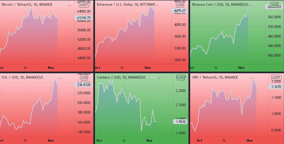 Динамика котировок BTC, ETH, ADA, BNB, XRP (дневной таймфрейм) и график доминации биткоина. Источник.