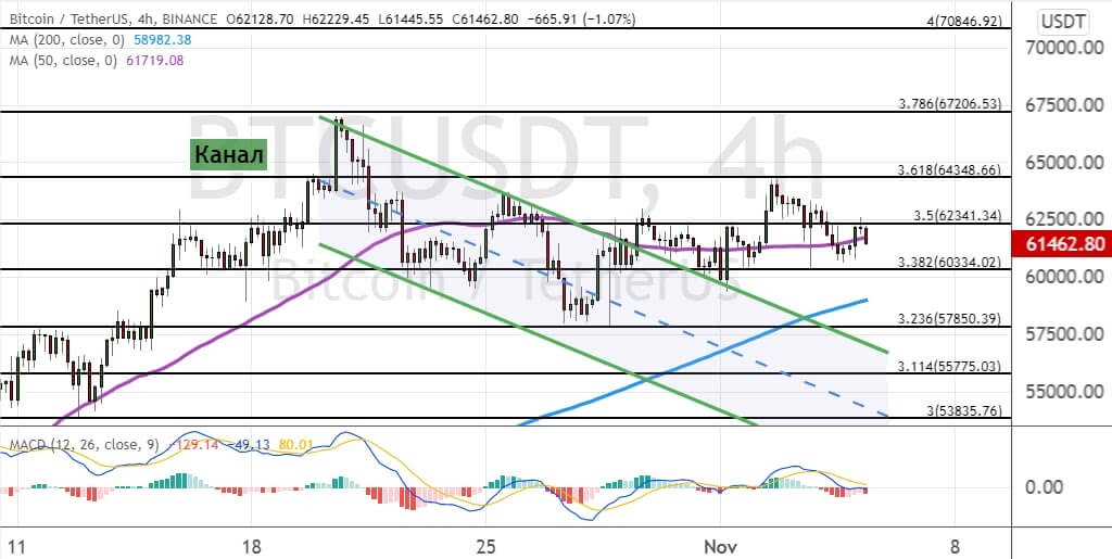 Однако если несколько дневных свечей закроются ниже уровня $58 350, то это станет сигналом о начале коррекции. В этом районе проходят 200-периодная SMA и границы модели теханализа «Канал» (показана на графике ниже зеленым цветом). Более глубокая коррекция пока представляется маловероятным сценарием развития торгов, однако ее наличие приведет к падению котировок BTC до уровней $55 800 и $53 800.
