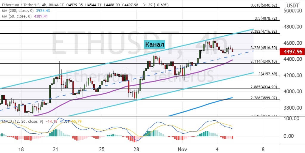 Котировки эфира во многом повторяют движение биткоина. После отскока от верхней границы модели теханализа «Канал» (показана на графике ниже бирюзовым цветом) они направились к уровню $4 500, в районе которого и проходят текущие торги.