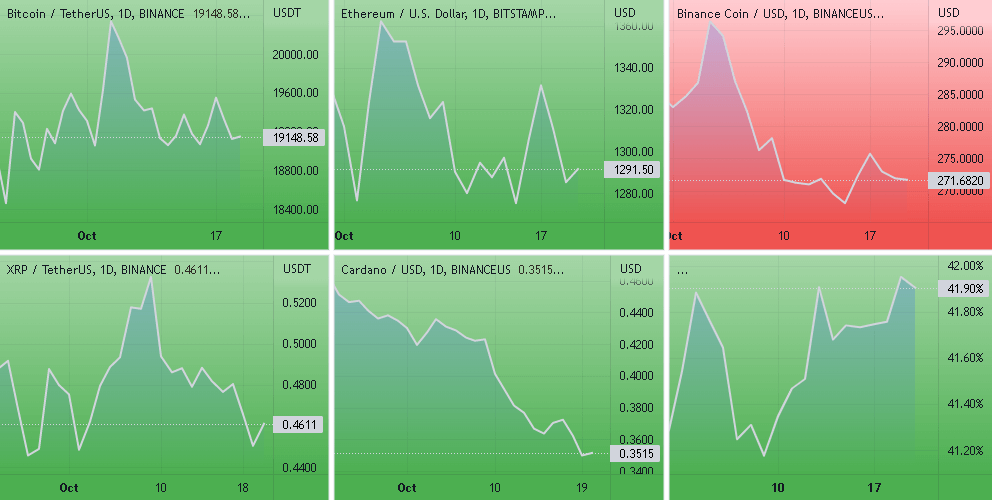 Динамика котировок BTC, ETH, BNB, ADA, XRP (дневной таймфрейм) и график доминации биткоина. Источник