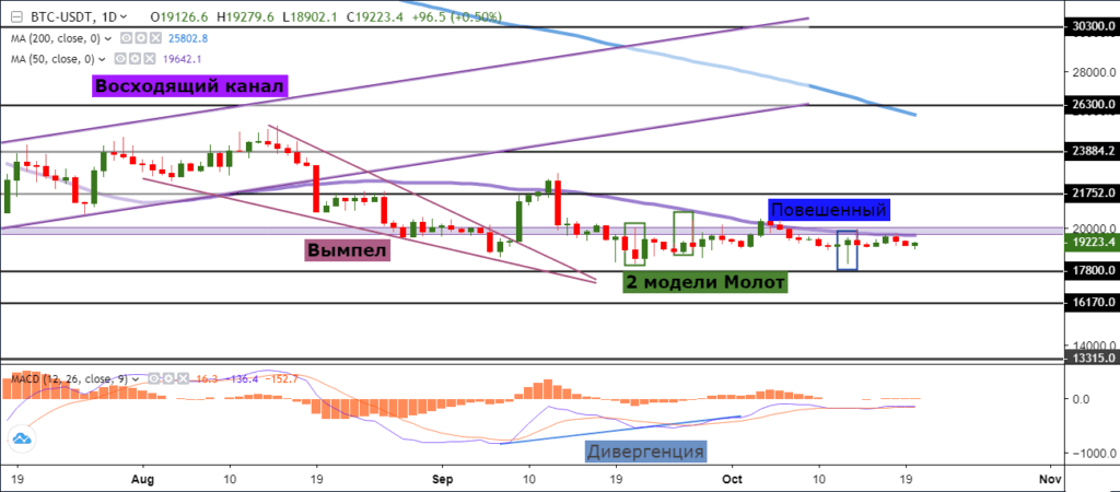 Текущие котировки биткоина продолжают консолидацию между уровнем поддержки $19 000, а текущими сопротивлениями выступают уровни $19 800 и $20 000, между которыми проходит линия 200-дневной SMA.