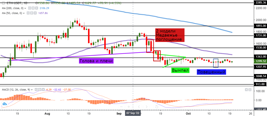 Падение стоимости актива ниже уровня текущей поддержки станет сигналом о восстановлении медвежьей динамики. В таком случае котировки ETH опустятся до первых целей на уровнях $1 200 и $1 100. Более глубокая коррекция направит актив к уровням $1 050 и $910. В пользу развития этого сценария торгов указывает сохраняющая актуальность модель теханализа «Голова и плечи» (отмечена фиолетовым цветом), а также две модели «Медвежье поглощение» (обозначены темно-розовым цветом) и преодоление нижней границы модели «Вымпел».