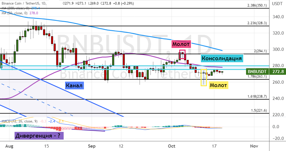 Закрытие дневных свечей выше границ консолидаций $275–$280 и $295–$300 приведет к подтверждению сигналов и восстановлению бычьей динамики. Это направит котировки альткоина к первой цели, расположенной в районе уровня $300, выше которого также расположилась линия 200-дневной SMA, и кластера $320–$330. Сохранение восходящего тренда позволит BNB продолжить рост до уровней $340, $350 и $366. В пользу реализации этого прогноза указывают сигналы в виде пробития верхней границы модели «Нисходящий канал» (обозначена синим цветом) и дивергенция между ценой на графике и осцилляторе MACD. Также в пользу бычьей динамики может указывать сигнал в виде модели «Молот» (обозначена желтым цветом).
