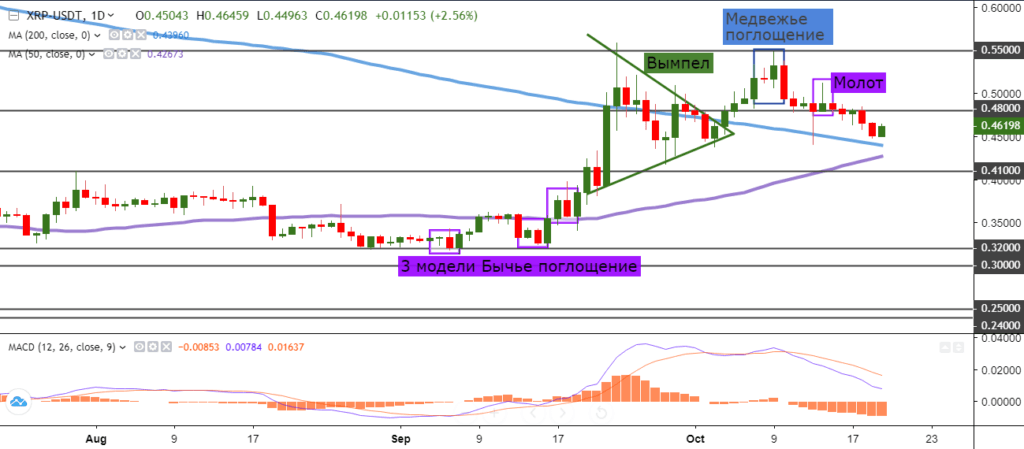 Текущие торги XRP проходят чуть выше уровня поддержки на $0.45 и под сопротивлением $0.48.