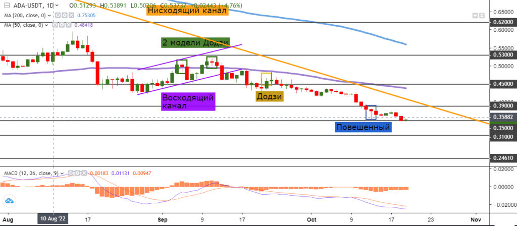Криптовалюта ADA продолжает развивать движение в районе поддержки $0.35, а текущими сопротивлениями выступают $0.4 и $0.45, между которыми проходит линия 50-дневной SMA.